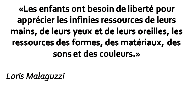 - D’apprendre l’expression de soi par les cent langages : Cette pédagogie permet aux enfants d’exercer leur droit d’expression en apprenant à s’exprimer grâce à leur créativité. L’enfant peut apprendre à s’exprimer par la musique, la cognition, le symbolisme, la métaphore, l’imaginaire, la logique, les arts, le jeu et par les mots.