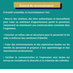 L’Énoncé de reconnaissance s’appuie sur les valeurs organisationnelles de Grandir ensemble : le respect, le professionnalisme et l’innovation. C’est une invitation à se reconnaître à tous les niveaux, afin de soutenir le sentiment d’appartenance et d’identité, tout en continuant de célébrer la diversité, l’inclusion et la créativité.